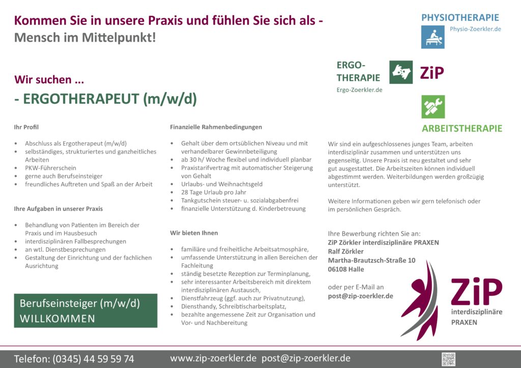 Wir suchen für unsere interdisziplinäre Praxis in Halle einen Physiotherapeuten (m/w/d). Zip Zörkler